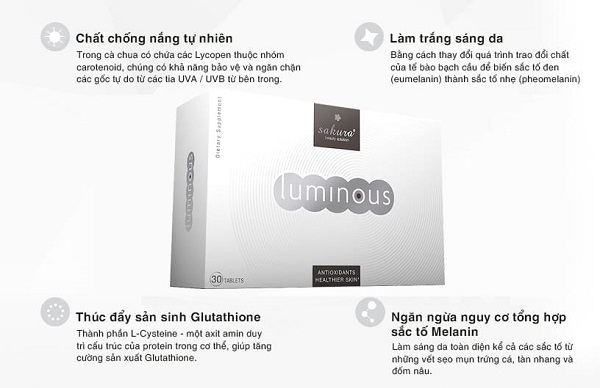 Viên Uống Cà Chua Sakura Luminous là sản phẩm chăm sóc sắc đẹp giúp làm trắng da và cải thiện độ đàn hồi của da. Với thành phần chính là bột cà chua trắng chứa Phytoene và Phytofluene, sản phẩm giúp bảo vệ da khỏi tác hại của gốc tự do và dưỡng da từ bên trong, mang lại làn da mịn màng, rạng rỡ, và căng mướt. Viên uống còn bổ sung các dưỡng chất quan trọng như Vitamin C, CoEnzym Q10, và L-Cystine giúp da khỏe mạnh, giảm nếp nhăn và làm sáng da hiệu quả.