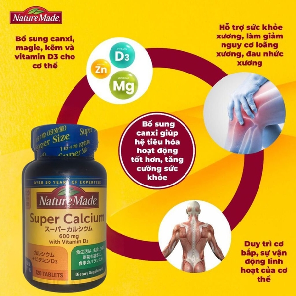 - Hỗ Trợ Xương Khỏe Mạnh: Cung cấp 600mg canxi và 5μg vitamin D giúp xương chắc khỏe và dẻo dai, ngăn ngừa nguy cơ mắc các bệnh xương khớp như loãng xương và thoái hóa khớp.