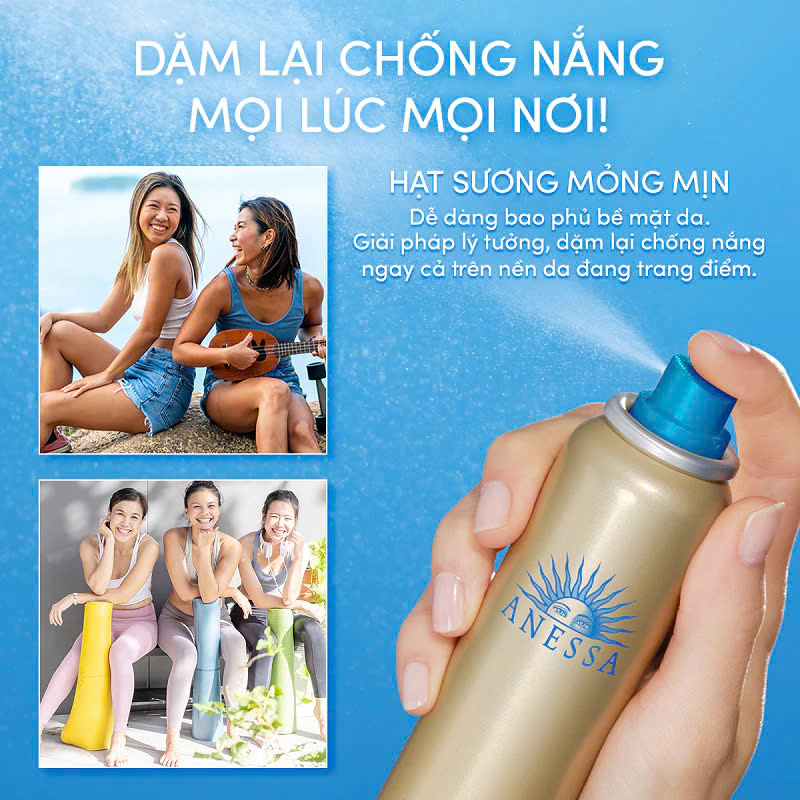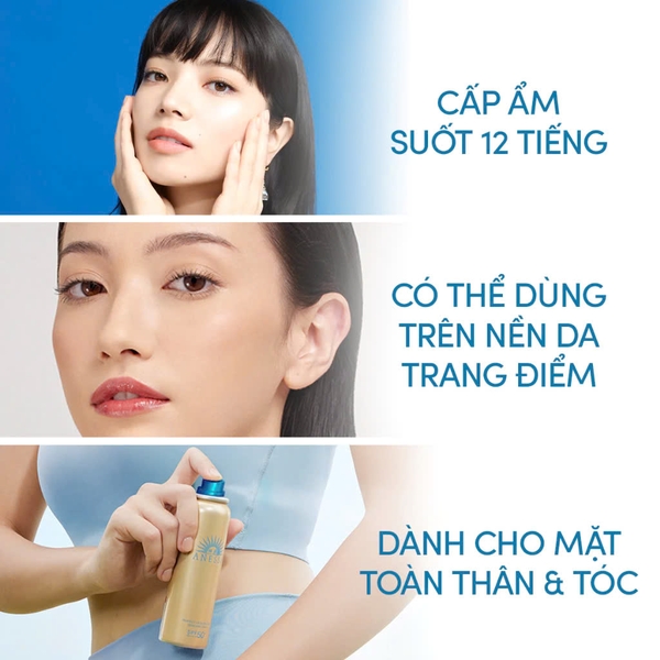 Xịt chống nắng Anessa dành cho mặt, cơ thể và tóc, thích hợp sử dụng hàng ngày và trong các hoạt động ngoài trời.